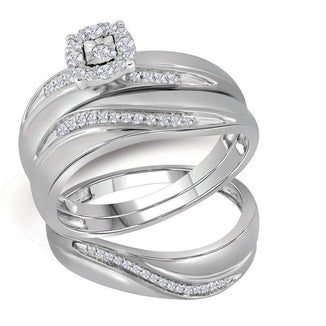 10k White Gold Round Diamond Mens Womens Trio Matching Halo Wedding Bridal Ring Set 1/5 Cttw