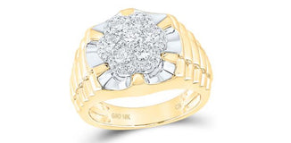 10K TWO-TONE YELLOW WHITE GOLD ROUND DIAMOND FLOWER CLUSTER RIBBED RING 1 CTTW