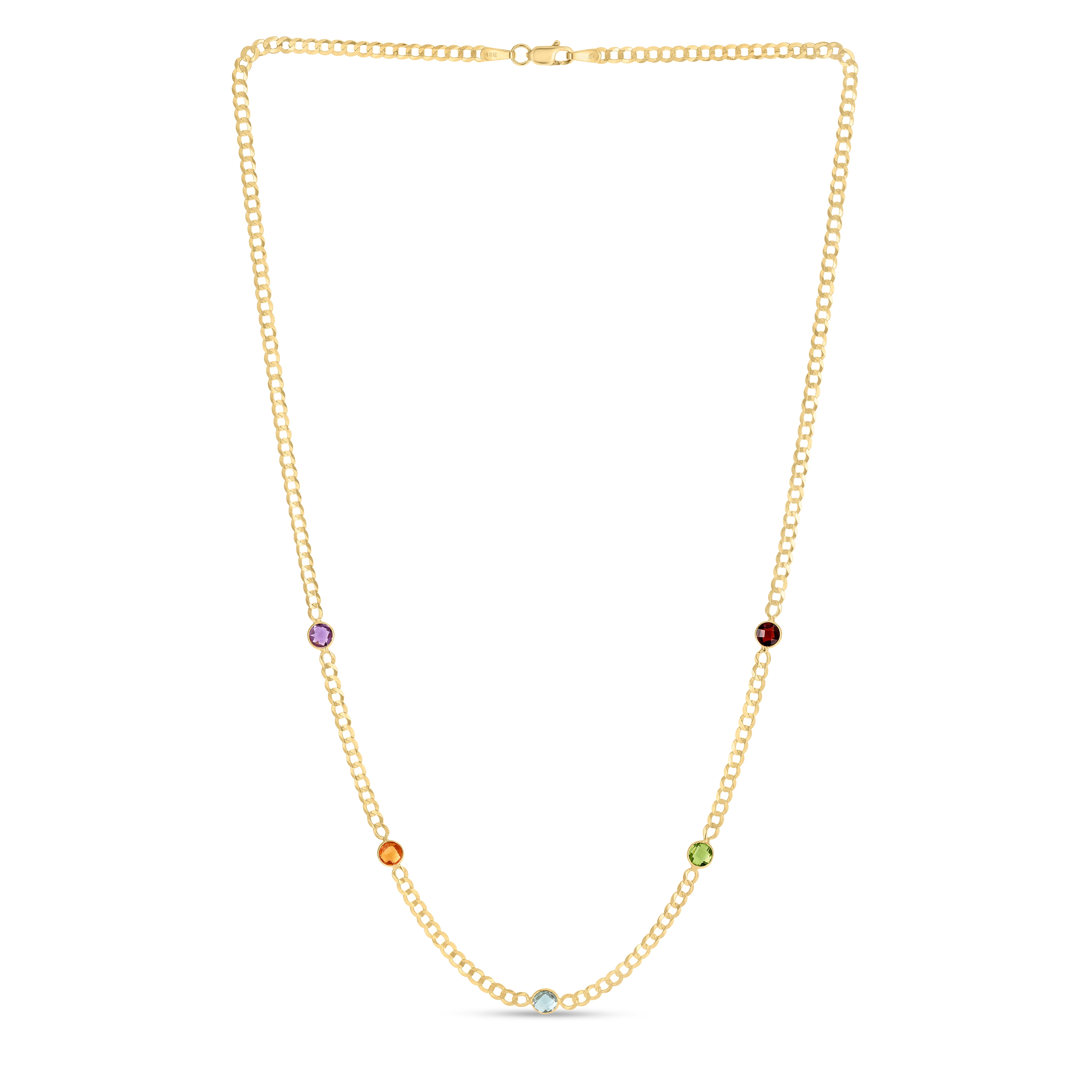 14K Yellow Gold Gemstone Curb 17" Chain Necklace with Lobster Clasp. Contains 4mm Round Briolette Citrine, 4mm Round Briolette Amethyst, 4mm Round Briolette Garnet, 4mm Round Briolette Peridot, 4mm Round Briolette Blue Topaz