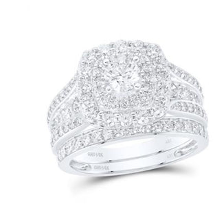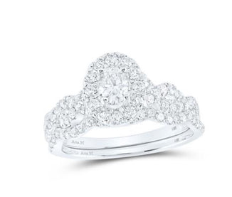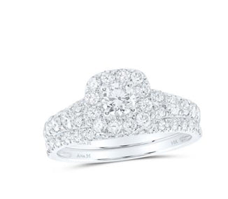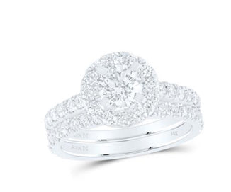 14K WHITE GOLD ROUND DIAMOND HALO BRIDAL WEDDING RING SET 1-1/2 CTTW (CERTIFIED)