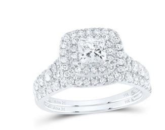 14K WHITE GOLD PRINCESS DIAMOND HALO BRIDAL WEDDING RING SET 1-1/2 CTTW (CERTIFIED)
